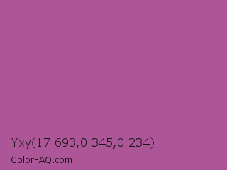 Yxy 17.693,0.345,0.234 Color is a normal magenta color and the nearest color is Pearly Purple #b768a2. Hex code #ac5698 and RGB value is rgb(172,86,152). In RGB color space, this color is composed of 67% red, 34% green, 60% blue, In CMYK color space, this color is composed of 0% cyan, 50% magenta, 12% yellow , 33% black , In HSL color space, this color has a hue angle of 314° , 34% saturation and 51% lightness.