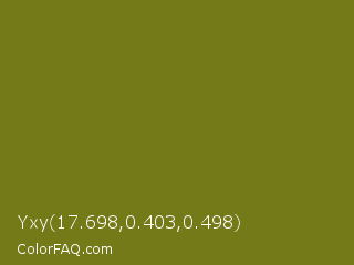 Yxy 17.698,0.403,0.498 Color is a dark yellow color and the nearest color is Pacifika #778120. Hex code #747a18 and RGB value is rgb(116,122,24). In RGB color space, this color is composed of 45% red, 48% green, 9% blue, In CMYK color space, this color is composed of 5% cyan, 0% magenta, 80% yellow , 52% black , In HSL color space, this color has a hue angle of 64° , 67% saturation and 29% lightness.