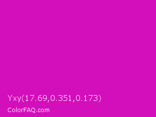 Yxy 17.69,0.351,0.173 Color is a normal magenta color and the nearest color is Deep Magenta #cc00cc. Hex code #d30ebb and RGB value is rgb(211,14,187). In RGB color space, this color is composed of 83% red, 5% green, 73% blue, In CMYK color space, this color is composed of 0% cyan, 93% magenta, 11% yellow , 17% black , In HSL color space, this color has a hue angle of 307° , 88% saturation and 44% lightness.