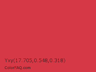 Yxy 17.705,0.548,0.318 Color is a normal red color and the nearest color is Jasper #d73b3e. Hex code #d73845 and RGB value is rgb(215,56,69). In RGB color space, this color is composed of 84% red, 22% green, 27% blue, In CMYK color space, this color is composed of 0% cyan, 74% magenta, 68% yellow , 16% black , In HSL color space, this color has a hue angle of 355° , 67% saturation and 53% lightness.