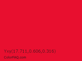 Yxy 17.711,0.606,0.316 Color is a normal red color and the nearest color is Medium Candy Apple Red #e2062c. Hex code #e80f2f and RGB value is rgb(232,15,47). In RGB color space, this color is composed of 91% red, 6% green, 18% blue, In CMYK color space, this color is composed of 0% cyan, 94% magenta, 80% yellow , 9% black , In HSL color space, this color has a hue angle of 351° , 88% saturation and 48% lightness.