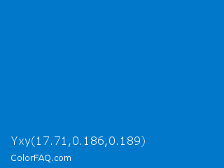 Yxy 17.71,0.186,0.189 Color is a normal blue color and the nearest color is Lochmara #007ec7. Hex code #0278ca and RGB value is rgb(2,120,202). In RGB color space, this color is composed of 1% red, 47% green, 79% blue, In CMYK color space, this color is composed of 99% cyan, 41% magenta, 0% yellow , 21% black , In HSL color space, this color has a hue angle of 205° , 98% saturation and 40% lightness.