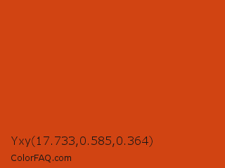 Yxy 17.733,0.585,0.364 Color is a normal orange color and the nearest color is Sinopia #cb410b. Hex code #d14412 and RGB value is rgb(209,68,18). In RGB color space, this color is composed of 82% red, 27% green, 7% blue, In CMYK color space, this color is composed of 0% cyan, 67% magenta, 91% yellow , 18% black , In HSL color space, this color has a hue angle of 16° , 84% saturation and 45% lightness.