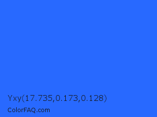 Yxy 17.735,0.173,0.128 Color is a normal blue color and the nearest color is Blue Crayola #1f75fe. Hex code #2869ff and RGB value is rgb(40,105,255). In RGB color space, this color is composed of 16% red, 41% green, 100% blue, In CMYK color space, this color is composed of 84% cyan, 59% magenta, 0% yellow , 0% black , In HSL color space, this color has a hue angle of 222° , 100% saturation and 58% lightness.