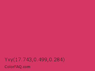 Yxy 17.743,0.499,0.284 Color is a normal rose color and the nearest color is Cerise Red #de3163. Hex code #d63663 and RGB value is rgb(214,54,99). In RGB color space, this color is composed of 84% red, 21% green, 39% blue, In CMYK color space, this color is composed of 0% cyan, 75% magenta, 54% yellow , 16% black , In HSL color space, this color has a hue angle of 343° , 66% saturation and 53% lightness.