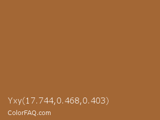 Yxy 17.744,0.468,0.403 Color is a normal orange color and the nearest color is Cape Palliser #a26645. Hex code #a36735 and RGB value is rgb(163,103,53). In RGB color space, this color is composed of 64% red, 40% green, 21% blue, In CMYK color space, this color is composed of 0% cyan, 37% magenta, 67% yellow , 36% black , In HSL color space, this color has a hue angle of 27° , 51% saturation and 42% lightness.