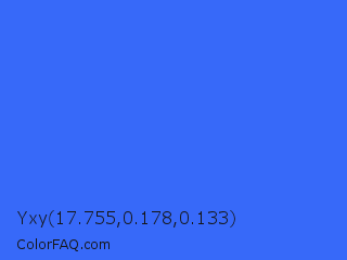 Yxy 17.755,0.178,0.133 Color is a normal blue color and the nearest color is Ultramarine Blue #4166f5. Hex code #3769f9 and RGB value is rgb(55,105,249). In RGB color space, this color is composed of 22% red, 41% green, 98% blue, In CMYK color space, this color is composed of 78% cyan, 58% magenta, 0% yellow , 2% black , In HSL color space, this color has a hue angle of 225° , 94% saturation and 60% lightness.