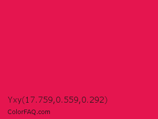 Yxy 17.759,0.559,0.292 Color is a normal rose color and the nearest color is Spanish Crimson #e51a4c. Hex code #e5154f and RGB value is rgb(229,21,79). In RGB color space, this color is composed of 90% red, 8% green, 31% blue, In CMYK color space, this color is composed of 0% cyan, 91% magenta, 66% yellow , 10% black , In HSL color space, this color has a hue angle of 343° , 83% saturation and 49% lightness.