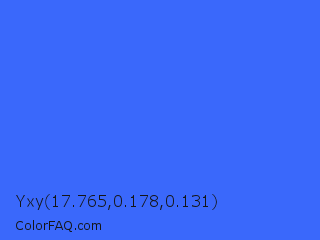 Yxy 17.765,0.178,0.131 Color is a light blue color and the nearest color is Ultramarine Blue #4166f5. Hex code #3a68fb and RGB value is rgb(58,104,251). In RGB color space, this color is composed of 23% red, 41% green, 98% blue, In CMYK color space, this color is composed of 77% cyan, 59% magenta, 0% yellow , 2% black , In HSL color space, this color has a hue angle of 226° , 96% saturation and 61% lightness.
