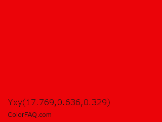 Yxy 17.769,0.636,0.329 Color is a normal red color and the nearest color is KU Crimson #e8000d. Hex code #eb0409 and RGB value is rgb(235,4,9). In RGB color space, this color is composed of 92% red, 2% green, 4% blue, In CMYK color space, this color is composed of 0% cyan, 98% magenta, 96% yellow , 8% black , In HSL color space, this color has a hue angle of 359° , 97% saturation and 47% lightness.