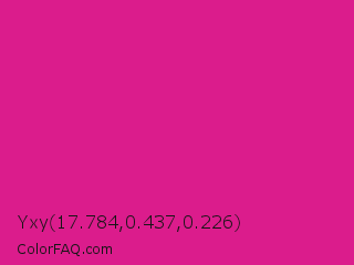 Yxy 17.784,0.437,0.226 Color is a normal magenta color and the nearest color is Barbie Pink #e0218a. Hex code #db1c8c and RGB value is rgb(219,28,140). In RGB color space, this color is composed of 86% red, 11% green, 55% blue, In CMYK color space, this color is composed of 0% cyan, 87% magenta, 36% yellow , 14% black , In HSL color space, this color has a hue angle of 325° , 77% saturation and 48% lightness.