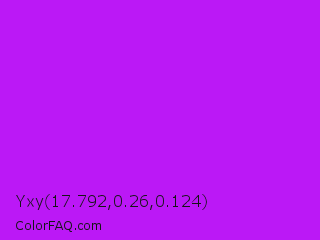Yxy 17.792,0.26,0.124 Color is a normal purple color and the nearest color is Vivid Mulberry #b80ce3. Hex code #bb18f6 and RGB value is rgb(187,24,246). In RGB color space, this color is composed of 73% red, 9% green, 96% blue, In CMYK color space, this color is composed of 24% cyan, 90% magenta, 0% yellow , 4% black , In HSL color space, this color has a hue angle of 284° , 93% saturation and 53% lightness.