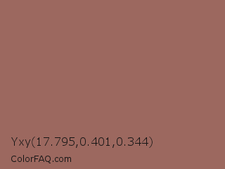 Yxy 17.795,0.401,0.344 Color is a normal red color and the nearest color is Dark Chestnut #986960. Hex code #9c685f and RGB value is rgb(156,104,95). In RGB color space, this color is composed of 61% red, 41% green, 37% blue, In CMYK color space, this color is composed of 0% cyan, 33% magenta, 39% yellow , 39% black , In HSL color space, this color has a hue angle of 9° , 24% saturation and 49% lightness.