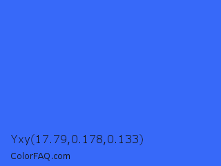 Yxy 17.79,0.178,0.133 Color is a normal blue color and the nearest color is Ultramarine Blue #4166f5. Hex code #3769f9 and RGB value is rgb(55,105,249). In RGB color space, this color is composed of 22% red, 41% green, 98% blue, In CMYK color space, this color is composed of 78% cyan, 58% magenta, 0% yellow , 2% black , In HSL color space, this color has a hue angle of 225° , 94% saturation and 60% lightness.