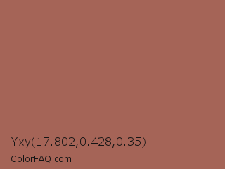 Yxy 17.802,0.428,0.35 Color is a normal red color and the nearest color is Redwood #a45a52. Hex code #a56457 and RGB value is rgb(165,100,87). In RGB color space, this color is composed of 65% red, 39% green, 34% blue, In CMYK color space, this color is composed of 0% cyan, 39% magenta, 47% yellow , 35% black , In HSL color space, this color has a hue angle of 10° , 31% saturation and 49% lightness.