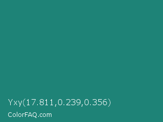 Yxy 17.811,0.239,0.356 Color is a normal cyan color and the nearest color is Elm #1c7c7d. Hex code #1e8377 and RGB value is rgb(30,131,119). In RGB color space, this color is composed of 12% red, 51% green, 47% blue, In CMYK color space, this color is composed of 77% cyan, 0% magenta, 9% yellow , 49% black , In HSL color space, this color has a hue angle of 173° , 63% saturation and 32% lightness.