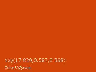 Yxy 17.829,0.587,0.368 Color is a normal orange color and the nearest color is Sinopia #cb410b. Hex code #d14508 and RGB value is rgb(209,69,8). In RGB color space, this color is composed of 82% red, 27% green, 3% blue, In CMYK color space, this color is composed of 0% cyan, 67% magenta, 96% yellow , 18% black , In HSL color space, this color has a hue angle of 18° , 93% saturation and 43% lightness.