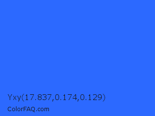 Yxy 17.837,0.174,0.129 Color is a normal blue color and the nearest color is Blue Crayola #1f75fe. Hex code #2c69ff and RGB value is rgb(44,105,255). In RGB color space, this color is composed of 17% red, 41% green, 100% blue, In CMYK color space, this color is composed of 83% cyan, 59% magenta, 0% yellow , 0% black , In HSL color space, this color has a hue angle of 223° , 100% saturation and 59% lightness.