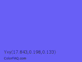 Yxy 17.843,0.198,0.133 Color is a light indigo color and the nearest color is Very Light Blue #6666ff. Hex code #685ff7 and RGB value is rgb(104,95,247). In RGB color space, this color is composed of 41% red, 37% green, 97% blue, In CMYK color space, this color is composed of 58% cyan, 62% magenta, 0% yellow , 3% black , In HSL color space, this color has a hue angle of 244° , 90% saturation and 67% lightness.