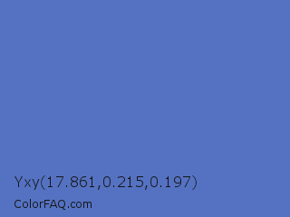Yxy 17.861,0.215,0.197 Color is a normal blue color and the nearest color is Indigo #4f69c6. Hex code #5572c2 and RGB value is rgb(85,114,194). In RGB color space, this color is composed of 33% red, 45% green, 76% blue, In CMYK color space, this color is composed of 56% cyan, 41% magenta, 0% yellow , 24% black , In HSL color space, this color has a hue angle of 224° , 47% saturation and 55% lightness.