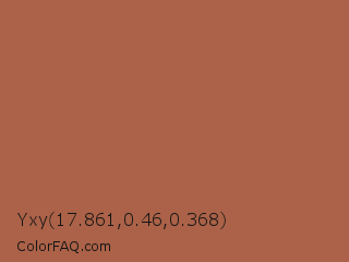 Yxy 17.861,0.46,0.368 Color is a normal orange color and the nearest color is Cape Palliser #a26645. Hex code #ab6248 and RGB value is rgb(171,98,72). In RGB color space, this color is composed of 67% red, 38% green, 28% blue, In CMYK color space, this color is composed of 0% cyan, 43% magenta, 58% yellow , 33% black , In HSL color space, this color has a hue angle of 16° , 41% saturation and 48% lightness.