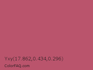 Yxy 17.862,0.434,0.296 Color is a normal red color and the nearest color is Popstar #be4f62. Hex code #ba546c and RGB value is rgb(186,84,108). In RGB color space, this color is composed of 73% red, 33% green, 42% blue, In CMYK color space, this color is composed of 0% cyan, 55% magenta, 42% yellow , 27% black , In HSL color space, this color has a hue angle of 346° , 43% saturation and 53% lightness.