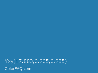 Yxy 17.883,0.205,0.235 Color is a normal blue color and the nearest color is Astral #327da0. Hex code #257cae and RGB value is rgb(37,124,174). In RGB color space, this color is composed of 15% red, 49% green, 68% blue, In CMYK color space, this color is composed of 79% cyan, 29% magenta, 0% yellow , 32% black , In HSL color space, this color has a hue angle of 202° , 65% saturation and 41% lightness.