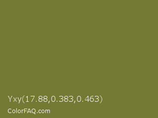 Yxy 17.88,0.383,0.463 Color is a normal yellow color and the nearest color is Pesto #7c7631. Hex code #747a34 and RGB value is rgb(116,122,52). In RGB color space, this color is composed of 45% red, 48% green, 20% blue, In CMYK color space, this color is composed of 5% cyan, 0% magenta, 57% yellow , 52% black , In HSL color space, this color has a hue angle of 65° , 40% saturation and 34% lightness.