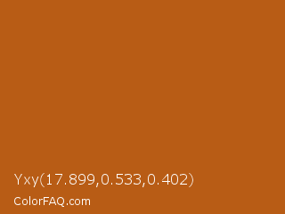 Yxy 17.899,0.533,0.402 Color is a normal orange color and the nearest color is Fiery Orange #b35213. Hex code #b85c15 and RGB value is rgb(184,92,21). In RGB color space, this color is composed of 72% red, 36% green, 8% blue, In CMYK color space, this color is composed of 0% cyan, 50% magenta, 89% yellow , 28% black , In HSL color space, this color has a hue angle of 26° , 80% saturation and 40% lightness.