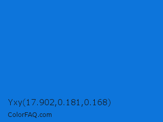 Yxy 17.902,0.181,0.168 Color is a normal blue color and the nearest color is Bright Navy Blue #1974d2. Hex code #0d75db and RGB value is rgb(13,117,219). In RGB color space, this color is composed of 5% red, 46% green, 86% blue, In CMYK color space, this color is composed of 94% cyan, 47% magenta, 0% yellow , 14% black , In HSL color space, this color has a hue angle of 210° , 89% saturation and 45% lightness.