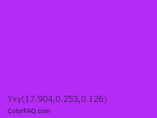 Yxy 17.904,0.253,0.126 Color is a normal purple color and the nearest color is Veronica #a020f0. Hex code #b32bf5 and RGB value is rgb(179,43,245). In RGB color space, this color is composed of 70% red, 17% green, 96% blue, In CMYK color space, this color is composed of 27% cyan, 82% magenta, 0% yellow , 4% black , In HSL color space, this color has a hue angle of 280° , 91% saturation and 56% lightness.