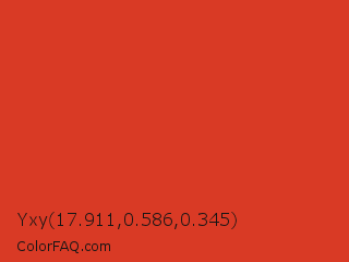 Yxy 17.911,0.586,0.345 Color is a normal red color and the nearest color is Vermilion #d9381e. Hex code #d93a25 and RGB value is rgb(217,58,37). In RGB color space, this color is composed of 85% red, 23% green, 15% blue, In CMYK color space, this color is composed of 0% cyan, 73% magenta, 83% yellow , 15% black , In HSL color space, this color has a hue angle of 7° , 71% saturation and 50% lightness.