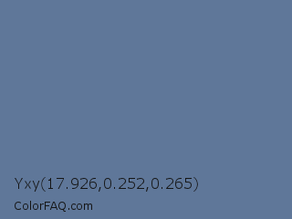 Yxy 17.926,0.252,0.265 Color is a normal blue color and the nearest color is Waikawa Gray #5a6e9c. Hex code #5f7799 and RGB value is rgb(95,119,153). In RGB color space, this color is composed of 37% red, 47% green, 60% blue, In CMYK color space, this color is composed of 38% cyan, 22% magenta, 0% yellow , 40% black , In HSL color space, this color has a hue angle of 215° , 23% saturation and 49% lightness.