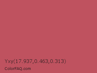 Yxy 17.937,0.463,0.313 Color is a normal red color and the nearest color is Popstar #be4f62. Hex code #bf525f and RGB value is rgb(191,82,95). In RGB color space, this color is composed of 75% red, 32% green, 37% blue, In CMYK color space, this color is composed of 0% cyan, 57% magenta, 50% yellow , 25% black , In HSL color space, this color has a hue angle of 353° , 46% saturation and 54% lightness.