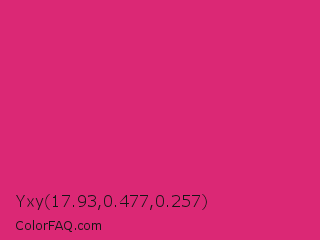 Yxy 17.93,0.477,0.257 Color is a normal rose color and the nearest color is Razzmatazz #e3256b. Hex code #db2875 and RGB value is rgb(219,40,117). In RGB color space, this color is composed of 86% red, 16% green, 46% blue, In CMYK color space, this color is composed of 0% cyan, 82% magenta, 47% yellow , 14% black , In HSL color space, this color has a hue angle of 334° , 71% saturation and 51% lightness.