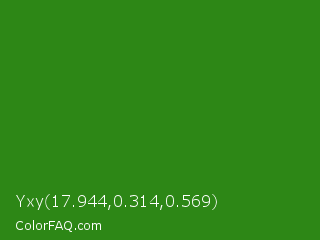 Yxy 17.944,0.314,0.569 Color is a normal green color and the nearest color is La Palma #368716. Hex code #2d8716 and RGB value is rgb(45,135,22). In RGB color space, this color is composed of 18% red, 53% green, 9% blue, In CMYK color space, this color is composed of 67% cyan, 0% magenta, 84% yellow , 47% black , In HSL color space, this color has a hue angle of 108° , 72% saturation and 31% lightness.