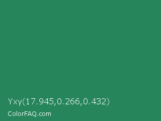 Yxy 17.945,0.266,0.432 Color is a normal green color and the nearest color is Eucalyptus #278a5b. Hex code #26855a and RGB value is rgb(38,133,90). In RGB color space, this color is composed of 15% red, 52% green, 35% blue, In CMYK color space, this color is composed of 71% cyan, 0% magenta, 32% yellow , 48% black , In HSL color space, this color has a hue angle of 153° , 56% saturation and 34% lightness.
