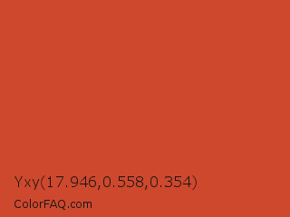 Yxy 17.946,0.558,0.354 Color is a normal red color and the nearest color is Valencia #d84437. Hex code #ce482d and RGB value is rgb(206,72,45). In RGB color space, this color is composed of 81% red, 28% green, 18% blue, In CMYK color space, this color is composed of 0% cyan, 65% magenta, 78% yellow , 19% black , In HSL color space, this color has a hue angle of 10° , 64% saturation and 49% lightness.