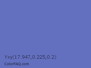 Yxy 17.947,0.225,0.2 Color is a normal blue color and the nearest color is Toolbox #746cc0. Hex code #6270bf and RGB value is rgb(98,112,191). In RGB color space, this color is composed of 38% red, 44% green, 75% blue, In CMYK color space, this color is composed of 49% cyan, 41% magenta, 0% yellow , 25% black , In HSL color space, this color has a hue angle of 231° , 42% saturation and 57% lightness.