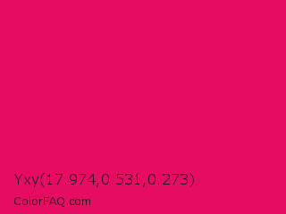 Yxy 17.974,0.531,0.273 Color is a normal rose color and the nearest color is Raspberry #e30b5d. Hex code #e60c61 and RGB value is rgb(230,12,97). In RGB color space, this color is composed of 90% red, 5% green, 38% blue, In CMYK color space, this color is composed of 0% cyan, 95% magenta, 58% yellow , 10% black , In HSL color space, this color has a hue angle of 337° , 90% saturation and 47% lightness.