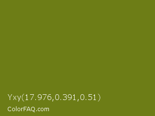Yxy 17.976,0.391,0.51 Color is a dark yellow color and the nearest color is Pacifika #778120. Hex code #6d7d16 and RGB value is rgb(109,125,22). In RGB color space, this color is composed of 43% red, 49% green, 9% blue, In CMYK color space, this color is composed of 13% cyan, 0% magenta, 82% yellow , 51% black , In HSL color space, this color has a hue angle of 69° , 70% saturation and 29% lightness.
