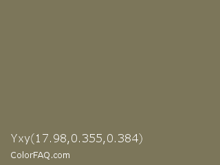 Yxy 17.98,0.355,0.384 Color is a normal yellow color and the nearest color is Pablo #776f61. Hex code #7c765a and RGB value is rgb(124,118,90). In RGB color space, this color is composed of 49% red, 46% green, 35% blue, In CMYK color space, this color is composed of 0% cyan, 5% magenta, 27% yellow , 51% black , In HSL color space, this color has a hue angle of 49° , 16% saturation and 42% lightness.