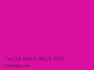 Yxy 18.004,0.402,0.202 Color is a normal magenta color and the nearest color is Barbie Pink #e0218a. Hex code #db10a1 and RGB value is rgb(219,16,161). In RGB color space, this color is composed of 86% red, 6% green, 63% blue, In CMYK color space, this color is composed of 0% cyan, 93% magenta, 26% yellow , 14% black , In HSL color space, this color has a hue angle of 317° , 86% saturation and 46% lightness.