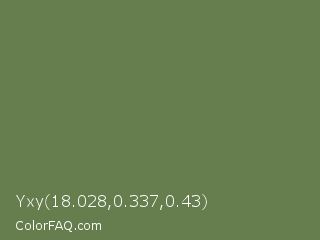 Yxy 18.028,0.337,0.43 Color is a normal green color and the nearest color is Dingley #5d7747. Hex code #667d4d and RGB value is rgb(102,125,77). In RGB color space, this color is composed of 40% red, 49% green, 30% blue, In CMYK color space, this color is composed of 18% cyan, 0% magenta, 38% yellow , 51% black , In HSL color space, this color has a hue angle of 89° , 24% saturation and 40% lightness.
