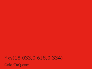 Yxy 18.033,0.618,0.334 Color is a normal red color and the nearest color is Lust #e62020. Hex code #e62218 and RGB value is rgb(230,34,24). In RGB color space, this color is composed of 90% red, 13% green, 9% blue, In CMYK color space, this color is composed of 0% cyan, 85% magenta, 90% yellow , 10% black , In HSL color space, this color has a hue angle of 3° , 81% saturation and 50% lightness.