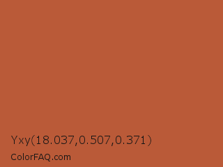 Yxy 18.037,0.507,0.371 Color is a normal orange color and the nearest color is Tuscany #bd5e2e. Hex code #ba5a38 and RGB value is rgb(186,90,56). In RGB color space, this color is composed of 73% red, 35% green, 22% blue, In CMYK color space, this color is composed of 0% cyan, 52% magenta, 70% yellow , 27% black , In HSL color space, this color has a hue angle of 16° , 54% saturation and 47% lightness.