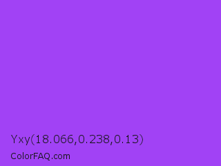 Yxy 18.066,0.238,0.13 Color is a light purple color and the nearest color is Navy Purple #9457eb. Hex code #a142f5 and RGB value is rgb(161,66,245). In RGB color space, this color is composed of 63% red, 26% green, 96% blue, In CMYK color space, this color is composed of 34% cyan, 73% magenta, 0% yellow , 4% black , In HSL color space, this color has a hue angle of 272° , 90% saturation and 61% lightness.