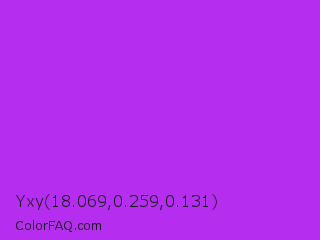 Yxy 18.069,0.259,0.131 Color is a normal purple color and the nearest color is Veronica #a020f0. Hex code #b52ef0 and RGB value is rgb(181,46,240). In RGB color space, this color is composed of 71% red, 18% green, 94% blue, In CMYK color space, this color is composed of 25% cyan, 81% magenta, 0% yellow , 6% black , In HSL color space, this color has a hue angle of 282° , 87% saturation and 56% lightness.