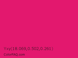 Yxy 18.069,0.502,0.261 Color is a normal rose color and the nearest color is Razzmatazz #e3256b. Hex code #e3186e and RGB value is rgb(227,24,110). In RGB color space, this color is composed of 89% red, 9% green, 43% blue, In CMYK color space, this color is composed of 0% cyan, 89% magenta, 52% yellow , 11% black , In HSL color space, this color has a hue angle of 335° , 81% saturation and 49% lightness.