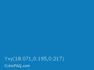 Yxy 18.071,0.195,0.217 Color is a normal blue color and the nearest color is Star Command Blue #007bb8. Hex code #0e7cba and RGB value is rgb(14,124,186). In RGB color space, this color is composed of 5% red, 49% green, 73% blue, In CMYK color space, this color is composed of 92% cyan, 33% magenta, 0% yellow , 27% black , In HSL color space, this color has a hue angle of 202° , 86% saturation and 39% lightness.